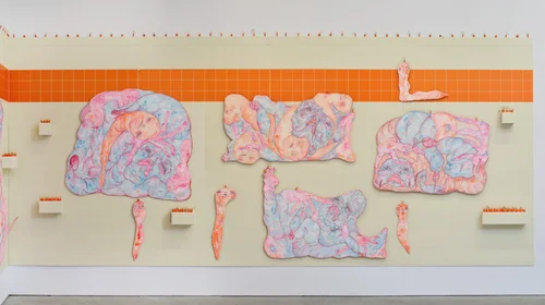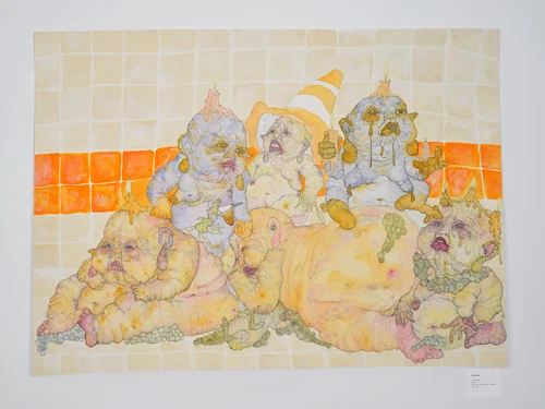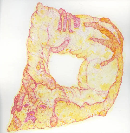 black light ink, M&Ms, india ink on paper, 30” x 20”