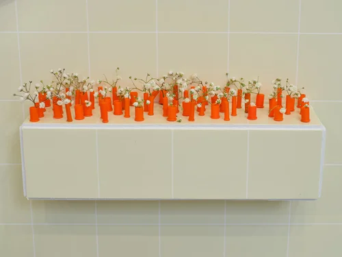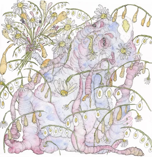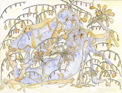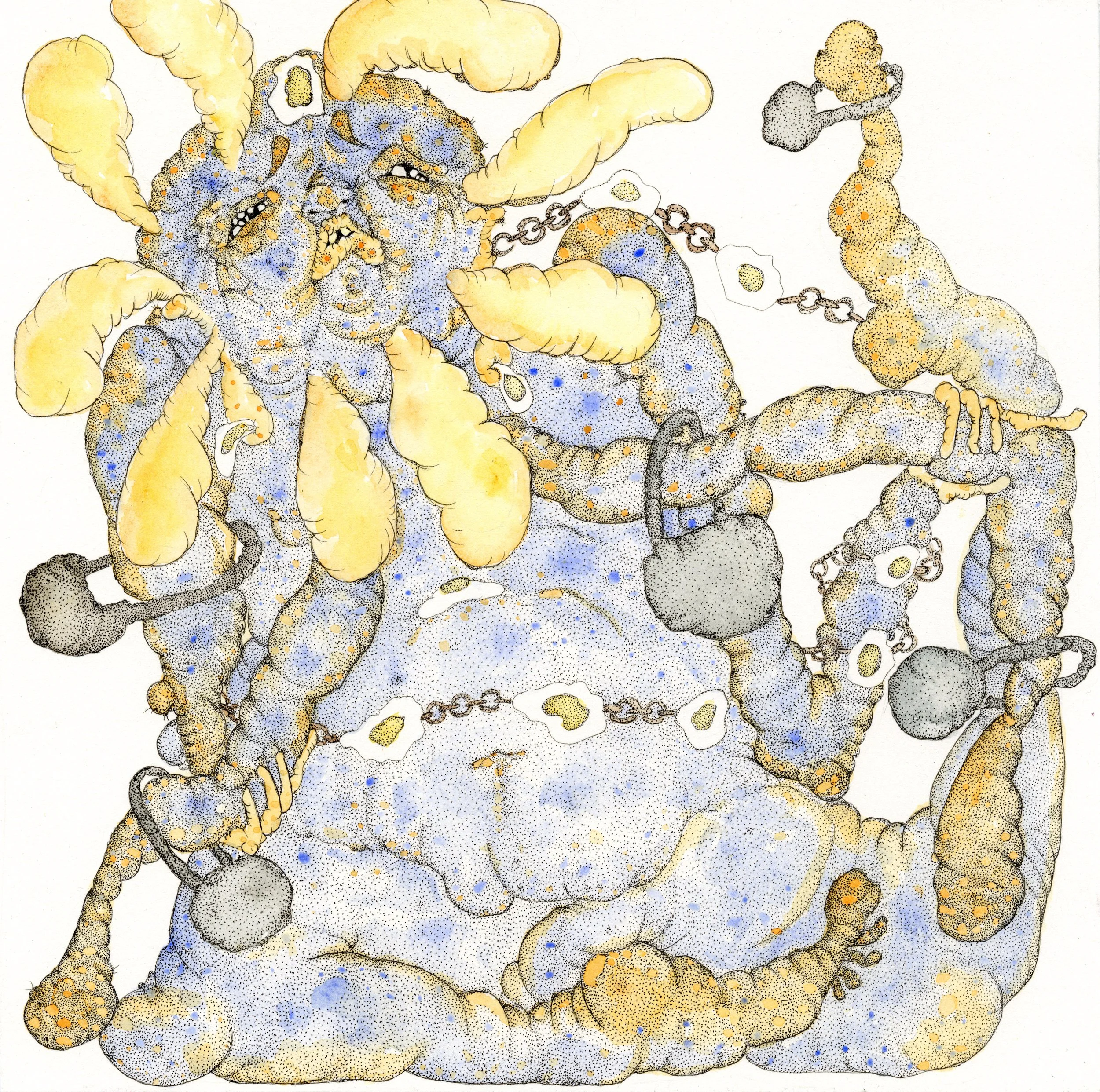 24” x 36”, pen and watercolor on paper on panel, found objects
